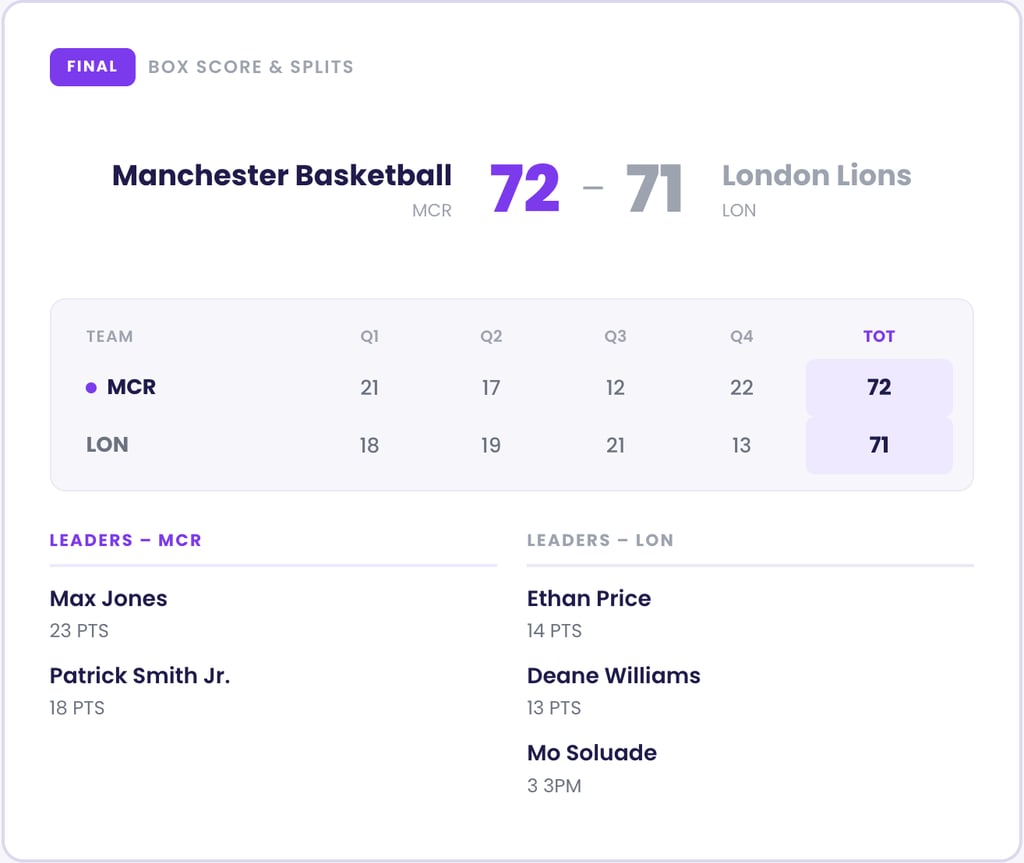 The Lions will reset before hosting Surrey 89ers next, but this loss will sting for weeks. Manchester just proved they can win at the Copper Box when everything goes wrong. When these two meet again with silverware on the line, that belief will matter more than any stat sheet.